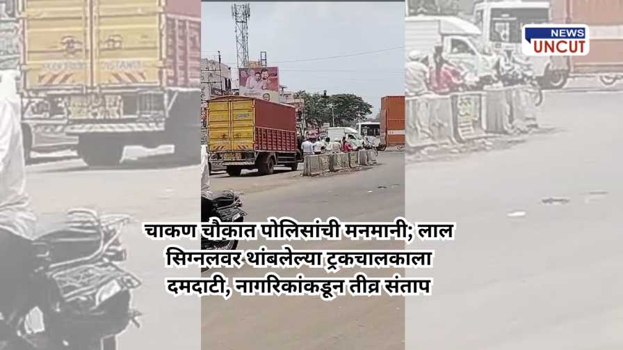 Truck Driver Harassed by Police at Chakan Chowk: चाकण चौकात भरदिवसा वाहतूक पोलिसांकडून सामान्य नागरिकांवर होत असलेला अन्याय पुन्हा एकदा समोर आला आहे. लाल सिग्नलला थांबलेल्या एका ट्रकचालकाला पोलिसांनी विनाकारण दमदाटी केल्याचा धक्कादायक प्रकार कॅमेऱ्यात कैद झाला आहे. या घटनेमुळे वाहतूक व्यवस्थेतील गोंधळ आणि पोलिसांच्या मनमानी कारभारावर पुन्हा एकदा प्रश्नचिन्ह निर्माण झाले आहे.