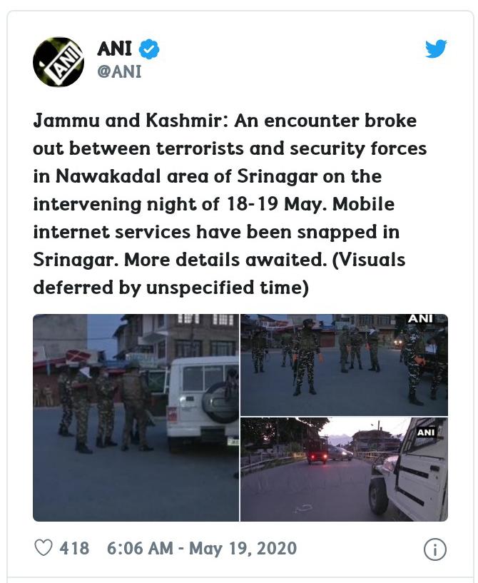 नवी दिल्ली (वृत्त संस्था), दि.१९ मे २०२०: जम्मू-काश्मीर येथे सोमवारी( दि.१८) रात्री उशिरा दहशतवाद्यांशी चकमक झाली. श्रीनगर भागांमधील नवाकदल या भागात अतिरेकी आणि सुरक्षा दलामध्ये ही चकमक झाली असल्याची माहिती समोर येत आहे. यानंतर श्रीनगरमधील मोबाइल इंटरनेट सेवा पूर्णपणे बंद करण्यात आली आहेत.