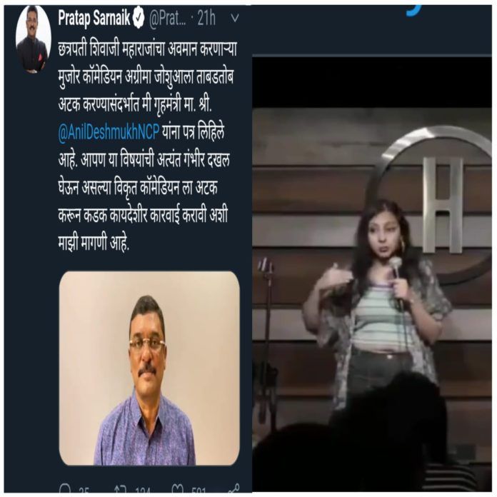 या व्हिडिओचा आणि शेत करत सरनाईक यांनी एक व्हिडीओ देखील बनवला आहे व तो सोशल मीडियावर टाकला आहे. हे व्हिडिओमध्ये ते म्हटले आहे की, “छत्रपती शिवाजी महाराजांचा अवमान करणाऱ्या मुजोर कॉमेडियन अग्रीमा जोशुआला ताबडतोब अटक करण्यासंदर्भात मी गृहमंत्री अनिल देशमुख यांना पत्र लिहिले आहे. आपण या विषयांची अत्यंत गंभीर दखल घेऊन असल्या विकृत कॉमेडियन ला अटक करून कडक कायदेशीर कारवाई करावी अशी माझी मागणी आहे.”