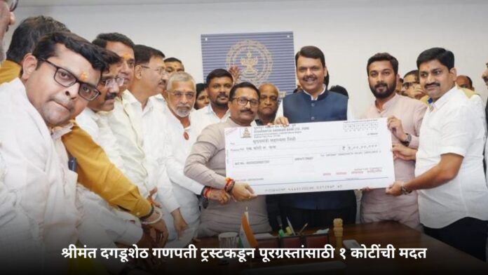 मानवसेवा हीच ईश्वरसेवा हे ब्रीद अंगीकारून कार्यरत असलेल्या श्रीमंत दगडूशेठ हलवाई सार्वजनिक गणपती ट्रस्ट तर्फे ‘मुख्यमंत्री सहायता निधी’साठी १ कोटी रुपयांचा धनादेश मुख्यमंत्री देवेंद्र फडणवीस यांना सुपूर्द करण्यात आला. तर, सुवर्णयुग सहकारी बँकेकडून २५ लाख रुपयांचा धनादेश देण्यात आला.