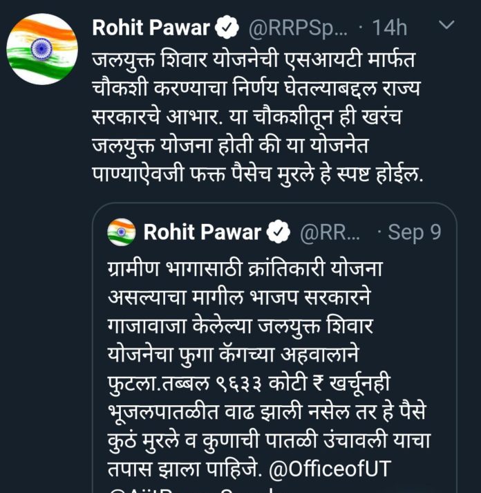 “जलयुक्त शिवार योजनेची एसआयटी मार्फत चौकशी करण्याचा निर्णय घेतल्याबद्दल राज्य सरकारचे आभार. या चौकशीतून ही खरंच जलयुक्त योजना होती की या योजनेत पाण्याऐवजी फक्त पैसेच मुरले हे स्पष्ट होईल,” अशी टीका रोहित पवार यांनी केली आहे.