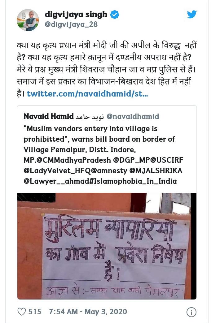 उत्तर प्रदेशमध्ये एका भाजप आमदारांनी मुस्लीम व्यक्तीकडून भाजी खरेदी करु नका असं जाहीर आवाहन केले होते. शिवाय त्याचे समर्थनही त्यानं केले होते. त्या दिवसानंतर लगेच मध्य प्रदेशमध्ये असणाऱ्या पेलमपूर गावात मुस्लीम व्यापाऱ्यांना गावात प्रवेश नाही असं पोस्टर आता झळकताना दिसत आहे. सोशल मिडियावर या पोस्टरची चांगलीच चर्चा सुरू आहे.