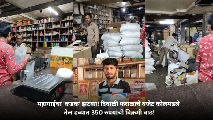 यंदाच्या दिवाळी फराळाच्या तयारीला महागाईची मोठी झळ बसली असून, गृहिणींचे बजेट पार कोलमडले आहे. गेल्या वर्षीच्या तुलनेत किराणा मालाच्या दरात सरासरी १० ते १५ टक्के वाढ झाल्यामुळे यंदाच्या खरेदीत कोणताही दिलासा मिळालेला नाही. यात सर्वाधिक वाढ खाद्यतेलाच्या डब्यात झाली असून, गतवर्षीच्या १९०० रुपयांवरून तो तब्बल २५५० रुपयांवर पोहोचला आहे, म्हणजेच एका डब्यामागे ३५० रुपयांची विक्रमी दरवाढ झाली आहे.