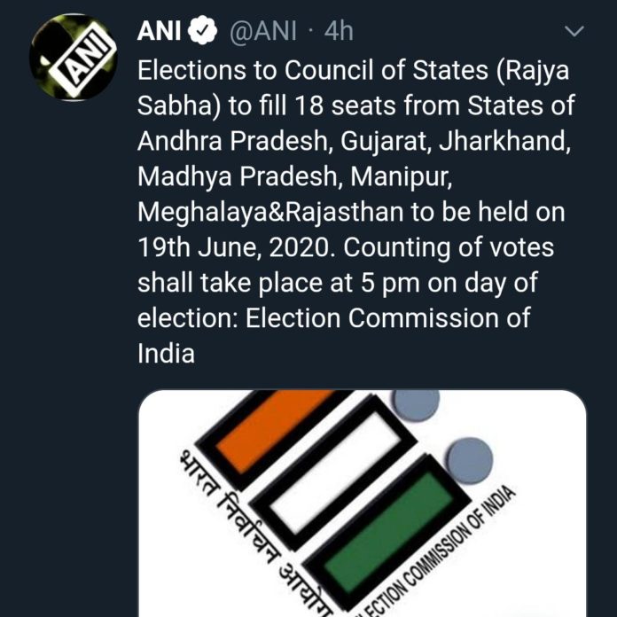 नवी दिल्ली, दि. २ जून २०२०: कोरोना विषाणूच्या जागतिक साथीमुळे राज्यसभा निवडणुका तहकूब करण्याबाबत निवडणूक आयोगाने निर्णय घेतला आहे. या निवडणुका १९ जून रोजी होणार आहेत. कोविड -१९ च्या संदर्भात आयोगाने २६ मार्च रोजी होणाऱ्या राज्यसभा निवडणुका तहकूब केल्या. या निवडणुकीची मतमोजणी १९ जून रोजी संध्याकाळी ५ वाजता होईल.