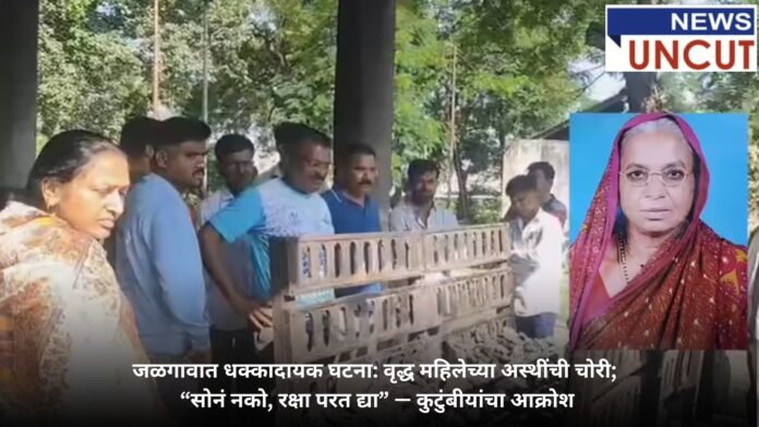 जळगाव शहरातील मेहरुन स्मशानभूमीत एक धक्कादायक प्रकार घडला आहे. वृद्ध महिलेच्या अस्थी चोरीला गेल्याची अभूतपूर्व घटना समोर आली असून, शहरात मोठी खळबळ उडाली आहे. गायत्री नगर येथील ८० वर्षीय छबाबाई काशिनाथ पाटील यांचे वृद्धापकाळाने निधन झाल्यानंतर सोमवारी त्यांच्या पार्थिवावर शोकाकुल वातावरणात अंत्यसंस्कार करण्यात आले. मृत्यूपूर्वी त्यांनी आपल्या कुटुंबीयांना — “अंगावरील दागिने काढू नका” — अशी शेवटची इच्छा व्यक्त केली होती. कुटुंबीयांनी ती इच्छा पूर्ण करत त्यांना सोन्याच्या दागिन्यांसह अग्नी दिला.