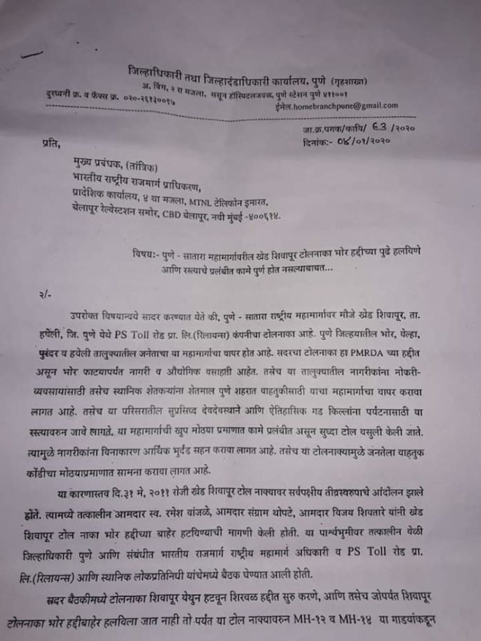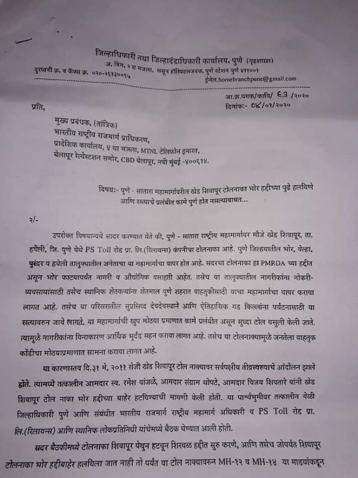 त्या अर्धवट पत्रकात पुणे-सातारा रस्त्यावरून प्रवास करणाऱ्या एम एच १२ आणि एम एच १४ पासिंगच्या वाहनांनी खेड-शिवापूर टोल नाक्यावर टोल भरू नये, हे आदेश जिल्हाधिकारी कार्यालयाने दिले आहेत.