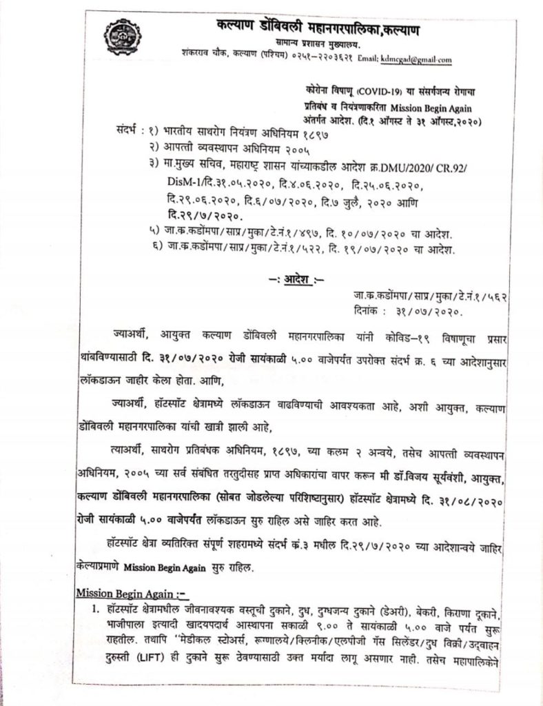भारत सरकारच्या अनलॉक ३ च्या घोषणेनंतर केडीएमसीत सुद्धा आज पासून हा हॉटस्पॉट क्षेत्रात लॉकडाऊन १ ते ३१ ऑगस्ट पर्यत केला आहे. हा लॉकडाऊन रोज सायंकाळी ५ वाजेपर्यत राहील असे कल्याण डोंबिवली महानगरपालिकेचे आयुक्त डॉ. विजय सुर्यवंशी यांनी सांगितले.