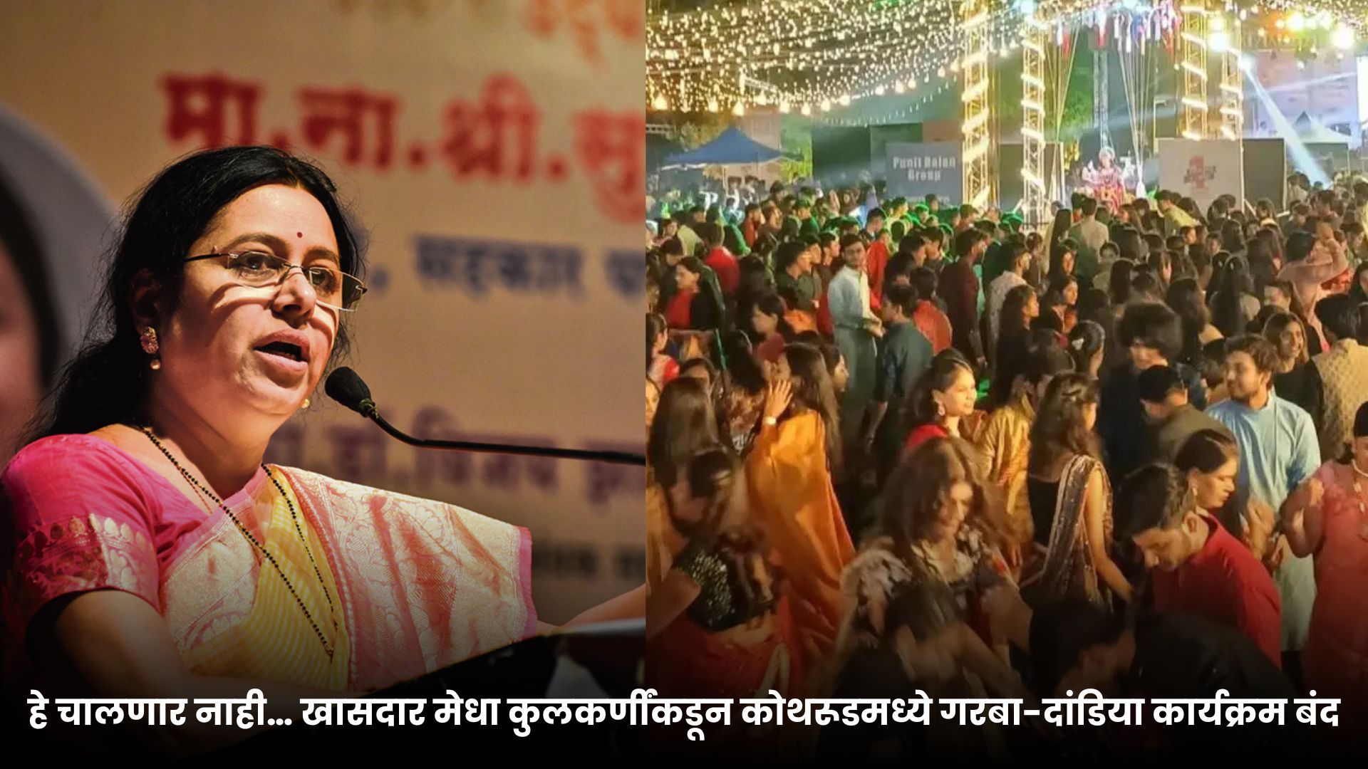 पुण्यातील कोथरूड येथील ‘जीत’ मैदानात शनिवारी (२७ सप्टेंबर) सायंकाळी सुरू असलेला गोंगाटयुक्त गरबा-दांडिया कार्यक्रम खासदार डॉ. मेधा कुलकर्णी यांनी थेट हस्तक्षेप करून बंद पाडला. नागरिकांनी मोठ्या आवाजामुळे तक्रार केली होती, मात्र पोलिसांकडून योग्य ती कारवाई झाली नव्हती. नागरिकांच्या तक्रारीनंतर खासदार कुलकर्णी कार्यक्रमस्थळी धाव घेतले आणि ठणकावून सांगितले की, “या आवाजामुळे नागरिकांना त्रास होत आहे. आवाजाची मर्यादा ओलांडून आणि सण-उत्सवाला गालबोट लागेल, अशा पद्धतीने कार्यक्रम होत आहेत. यापुढे जीत मैदानात असे कार्यक्रम होऊ देणार नाही.”
