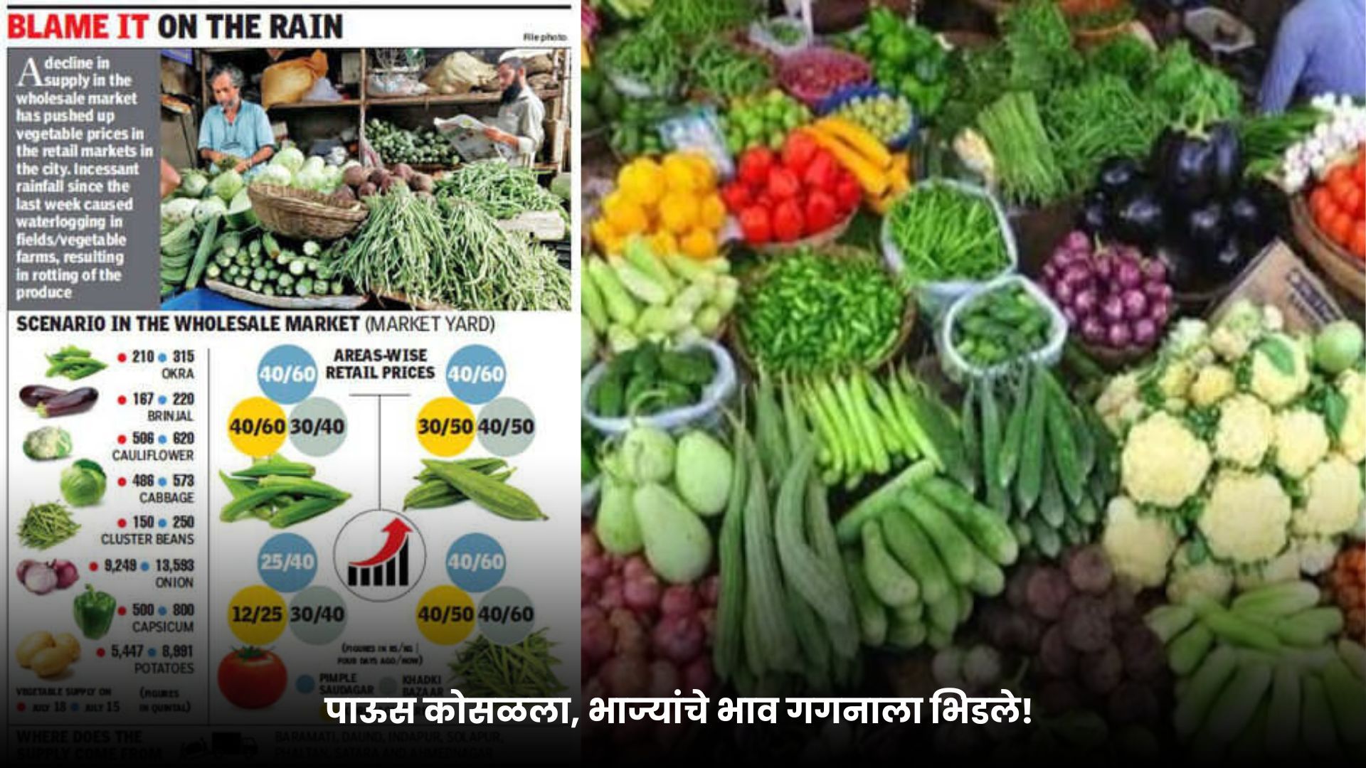 पिंपरी-चिंचवड शहरात मुसळधार पावसामुळे भाजीपाल्याच्या आवकेत मोठी घट झाल्याने बाजारात भाज्यांचे दर कडाडले आहेत. अनेक भाज्यांनी शंभरी ओलांडल्यामुळे सामान्य नागरिकांचे महिन्याचे बजेट पूर्णपणे कोलमडले आहे. किरकोळ बाजारात काही भाज्यांचे दर तर दुप्पट झाले आहेत.