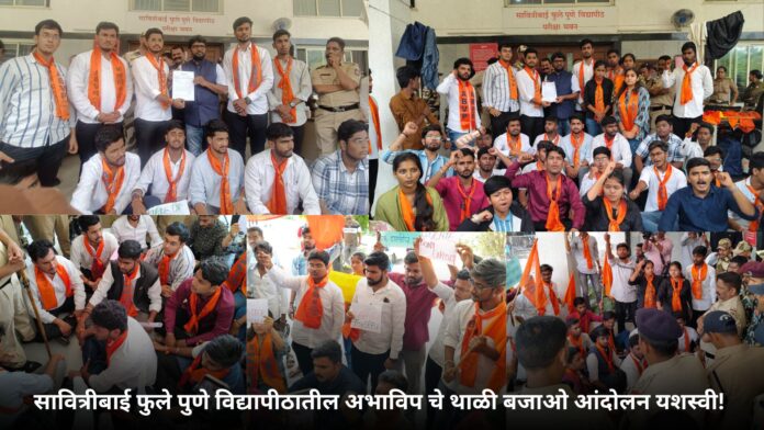 महाराष्ट्रातील अतिवृष्टीच्या पार्श्वभूमीवर अखिल भारतीय विद्यार्थी परिषद (अभाविप) तर्फे सावित्रीबाई फुले पुणे विद्यापीठामध्ये थाळी बजाओ आंदोलन यशस्वी ठरले आहे. या आंदोलनाच्या जोरावर विद्यापीठाने सर्व विद्यार्थ्यांचे परीक्षा शुल्क सरसकट माफ करण्याचे आश्वासन दिले आहे आणि ज्या विद्यार्थ्यांनी आधीच शुल्क भरले आहे त्यांना परतावा दिला जाईल, असे विद्यापीठाने लेखी स्वरूपात मान्य केले आहे.