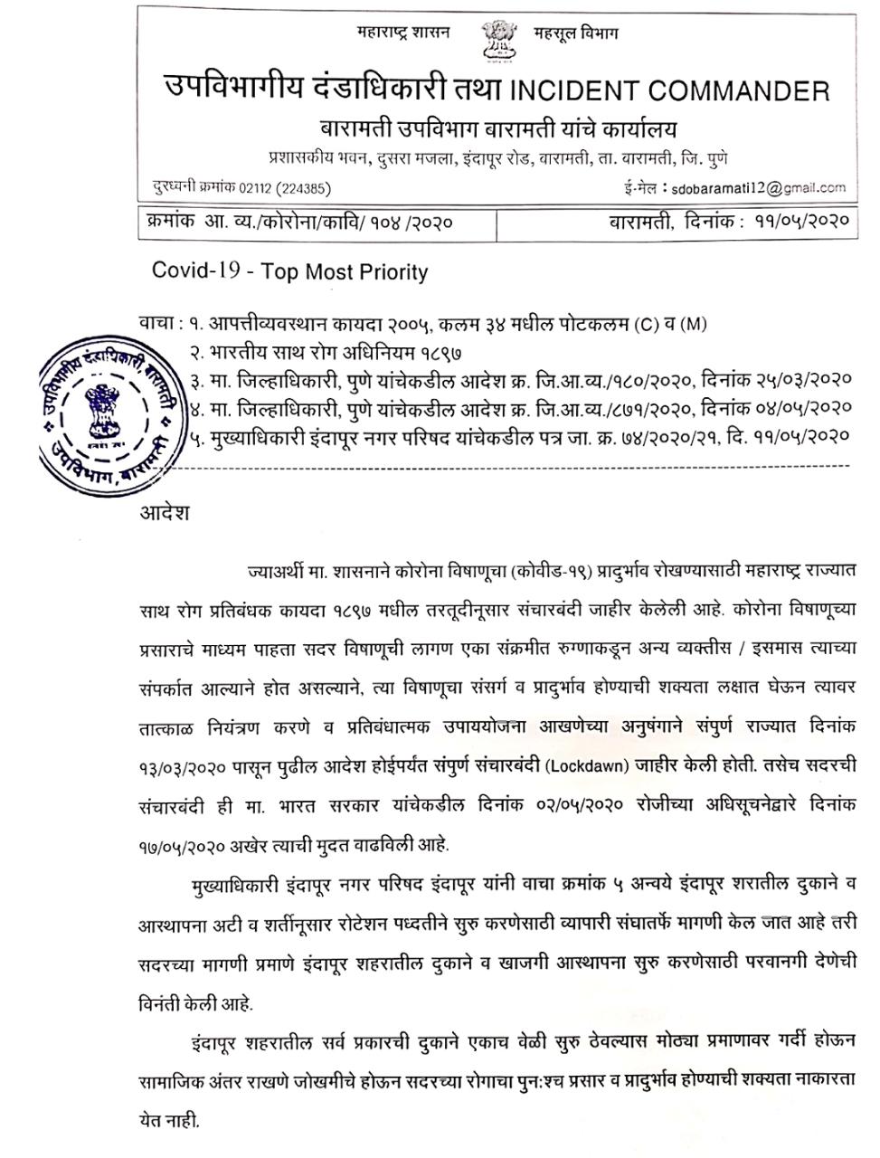 इंदापूर, दि. १२ मे २०२० : शासनाने कोरांना विषाणूचा प्रादुर्भाव रोखण्यासाठी महाराष्ट्र राज्यात साथ रोग प्रतिबंधक कायदा १८५७ मधील तरतूदीनूसार संधारवंटी जाहीर केलेली होती. कोरोना विषाणूच्या प्रसाराचे माध्यम पाहता सदर विषाणूची लागण एका संक्रमित व्यक्तीकडून अन्य व्यक्तीस / इसमास त्याच्या संपर्कात आल्याने होत असल्याने, त्या विषाणूचा संसर्ग व प्रादुर्भाव होण्याची शक्यता लक्षात घेऊन त्यावर नियंत्रण आणि प्रतिबंध करण्यासाठी प्रतिबंधात्मक उपाय आखण्याच्या अनुषंगाने संपूर्ण राज्यात दि. १३ मार्च पासून पुढील आदेश होईपर्यंत टाळेबंदी जाहीर केली होती. सदरची संचारबंदी ही भारत सरकार याचेकडील दि.२ मे रोजीच्या अधिसूचनेनुसार दि. ३० अखेर त्याची मुदत संपत असल्याने इंदापूर नगरपरिषदेचे मुख्याधिकारी प्रदीप ठेंगल यांनी उपविभागीय दंडाधिकारी यांना इंदापूर शहरातील दुकान व आस्थापना अटी व शर्तीनूसार रोटेशन पध्दतीने सुरु करण्यासाठी व्यापारी संघातर्फे मागणी केली जात असल्याने शहरातील दुकाने व खाजगी आस्थापना सुरु करण्यासाठी परवानगी मागितली होती.
