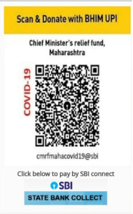 राज्यशासन आज अनेक पातळीवर कोरोना विषाणुविरुद्ध लढत आहे अशा परिस्थितीत मुख्यमंत्री सहाय्यता निधीत देणगीची रक्कम जमा करून शासनाला सहकार्य करणारे सर्व हात अनमोल आहेत. ज्यांना मुख्यमंत्री सहाय्यता निधीत रक्कम जमा करून या कामात सहभागी व्हायचे आहे, त्यांच्यासाठी मदत जमा करण्याबाबतची माहिती खालीलप्रमाणे आहे.