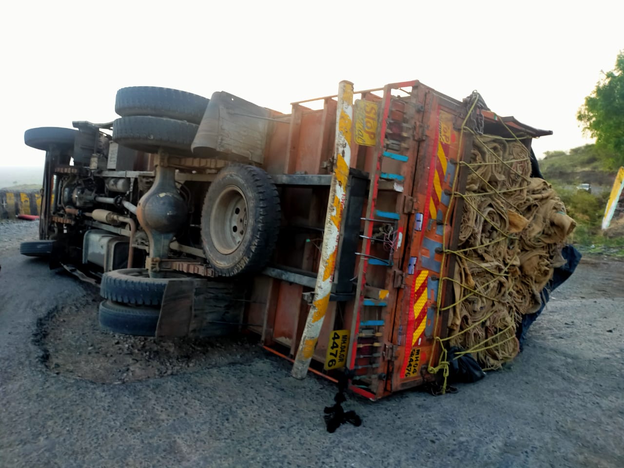 पाथर्डी, दि.७ जून २०२० : पाथर्डी तालुक्यातील करंजीघाट येथे रविवारी चाकणहून नांदेडकडे बारदाना घेऊन जाणाऱ्या ट्रकचा ब्रेक नादुरुस्त झाल्याने ट्रक रस्त्यावर उलटला. त्यामुळे काही वेळ वाहतुकीचा खोळंबा झाला होता. या अपघातामध्ये ट्रक चालक किरकोळ जखमी झाला आहे .