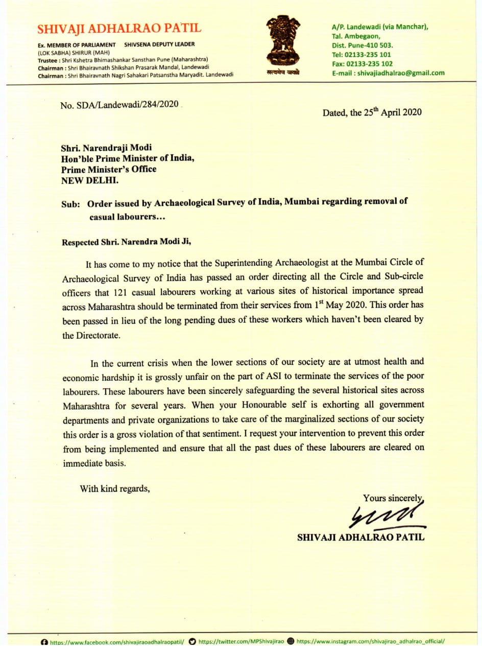 मंचर,दि. २५ एप्रिल २०२० :महाराष्ट्रातील ऐतिहासिक व पुरातत्व वास्तूंचे जतन संवर्धनाचे काम करणाऱ्या केंद्रीय कर्मचाऱ्यांना पूर्ववत सेवेत रुजू करावे अशी मागणी माजी खासदार शिवाजीराव आढळराव पाटील यांनी पंतप्रधान नरेंद्रजी मोदी यांच्याकडे केली आहे.