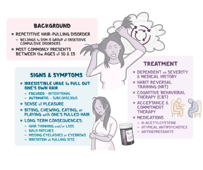 या समस्येत व्यक्ती अनियंत्रितपणे आपले केस ओढते, सामान्यतः एक-एक केस काढते. बऱ्याचदा व्यक्ती एकाच ठिकाणचे केस सातत्याने ओढते. सर्वात सामान्य ठिकाणे म्हणजे डोक्याचे केस, भुवया, पापण्या आणि काहीवेळा जांघेचे केस. ही सवय लहान मुलांमध्ये स्वतःला शांत करण्याचा एक मार्ग म्हणून दिसते आणि ती बऱ्याचदा कालांतराने थांबतेसुद्धा. परंतु किशोरवयीन आणि प्रौढांमध्ये ही समस्या अधिक गंभीर बनते आणि त्यांच्यावर दीर्घकालीन परिणाम करू शकते.