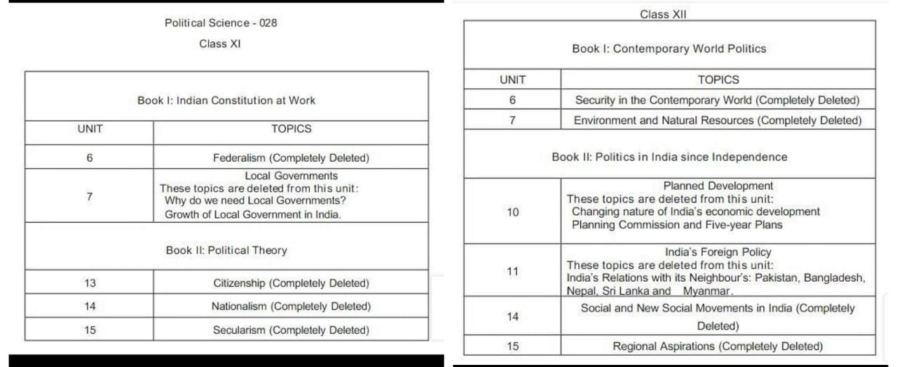 ११ वीच्या विद्यार्थ्यांच्या अभ्यासक्रमातून भारताची संघराज्य पद्धती, राज्य सरकार, नागरिकत्व, राष्ट्रवाद आणि धर्मनिरपेक्षता असे विषय वगळण्यात आले आहेत. हा अभ्यासक्रम एका वर्षासाठीच काढला आहे.